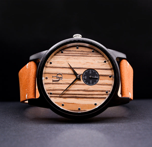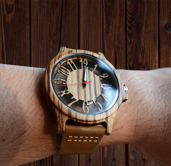 UXD Personalized/Engraved Exotic Zebra Wood Face Watch with Genuine Leather Band