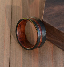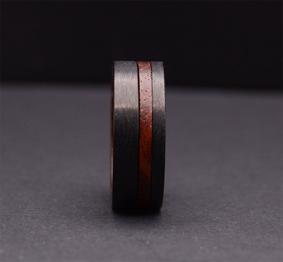 This Wonderful ring made with a rose wood inlay combine a warm earthy design with the durability of tungsten carbide.