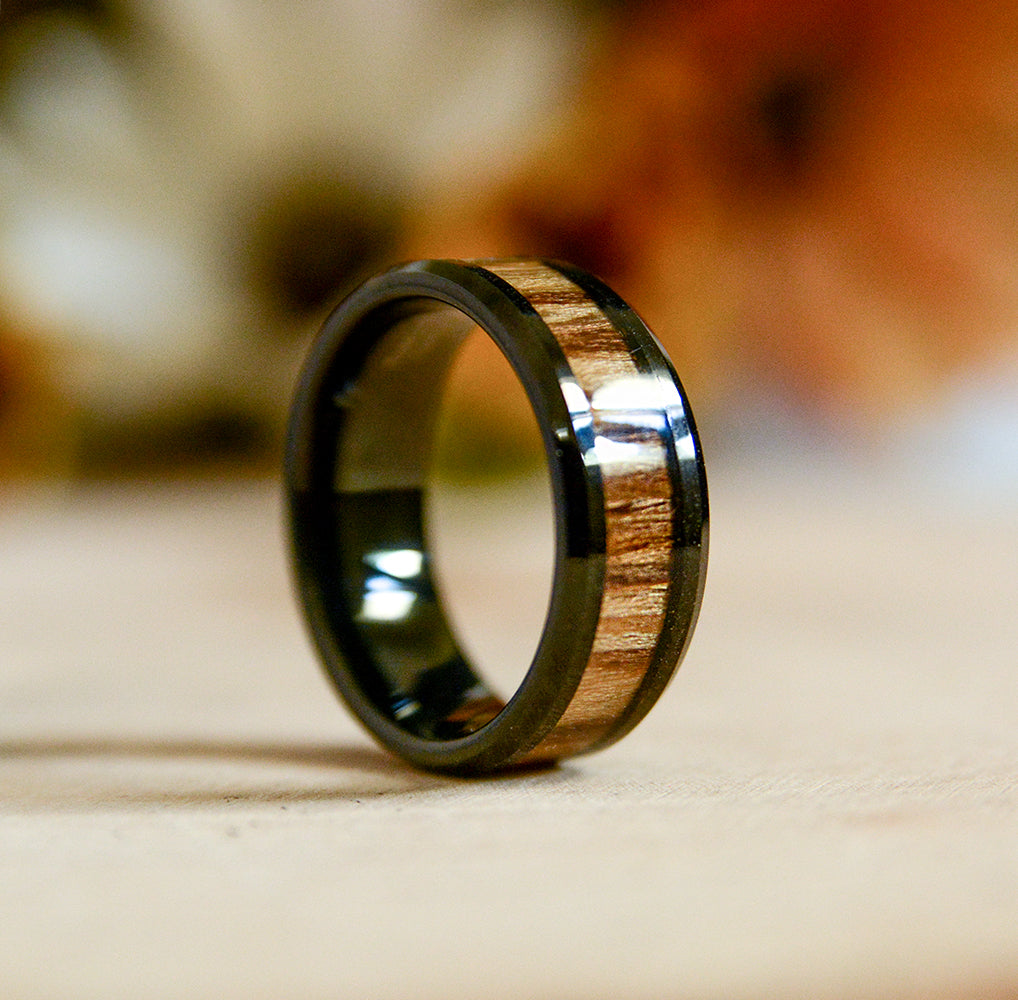 Mens Wedding Band Black Tungsten Carbide Ring Wood Inlay