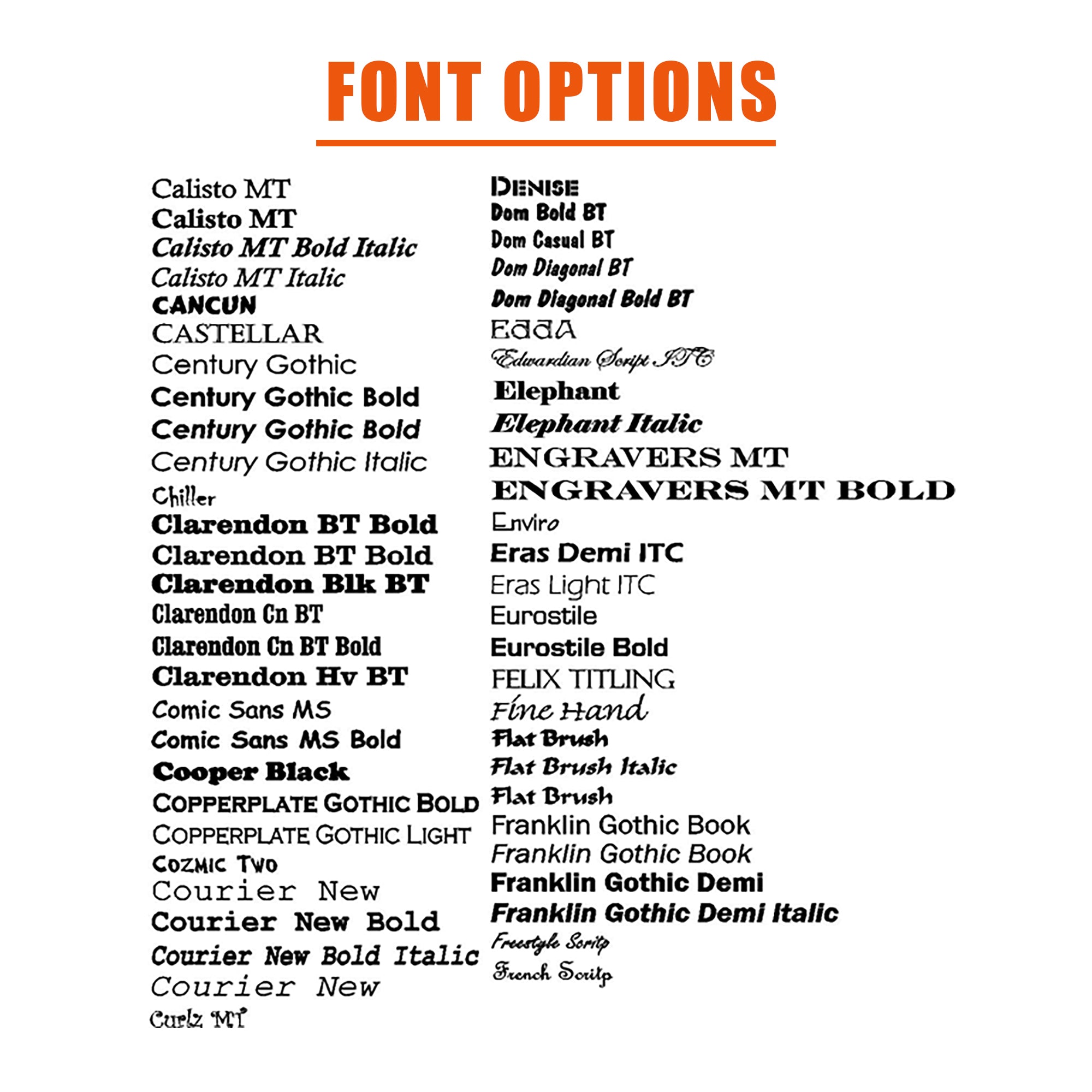 For fonts option, we suggest you google "fonts" and let us know which one would you like to use.